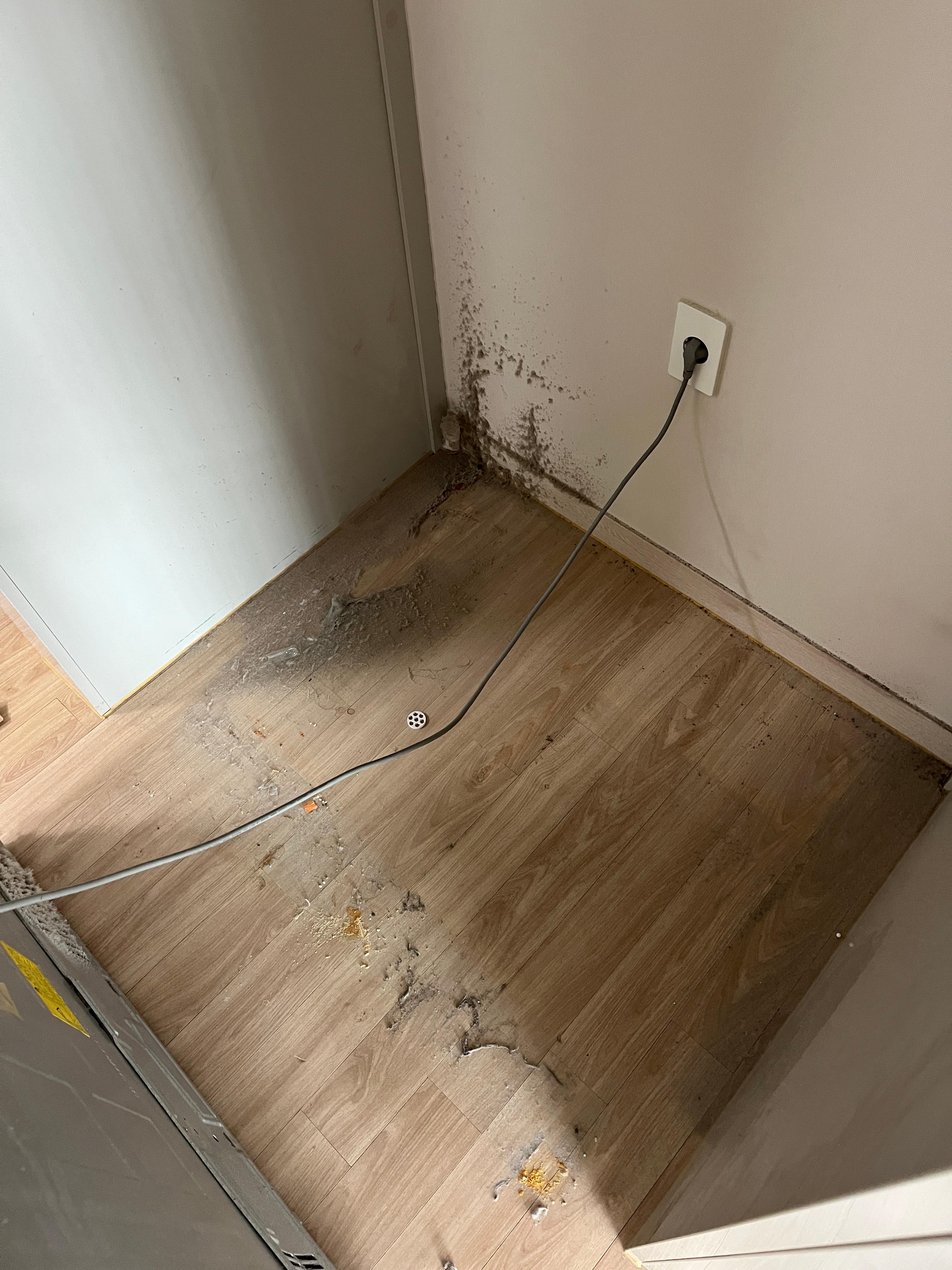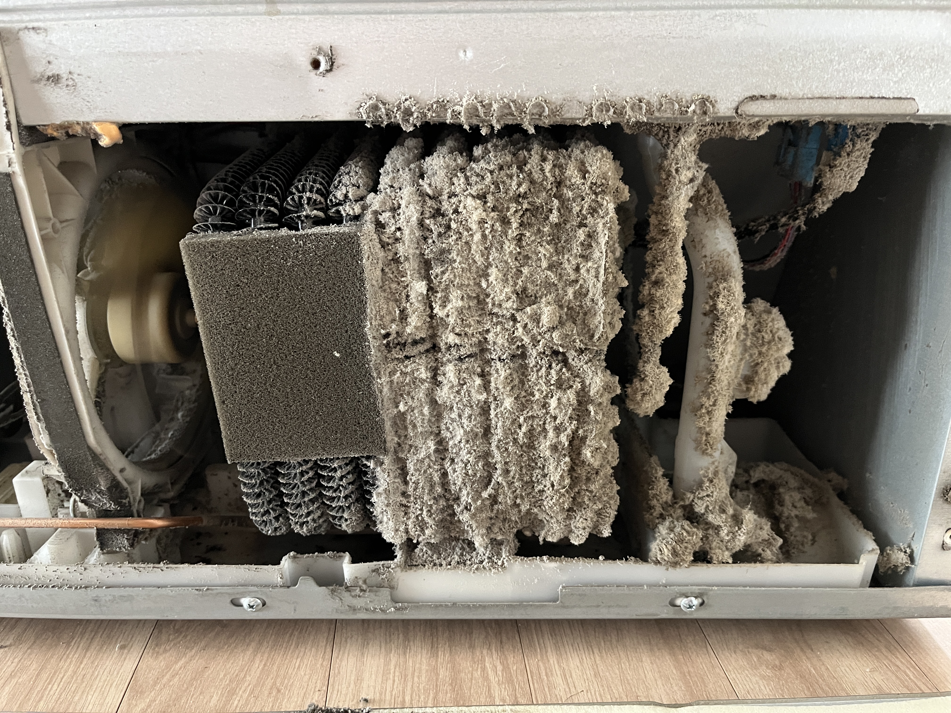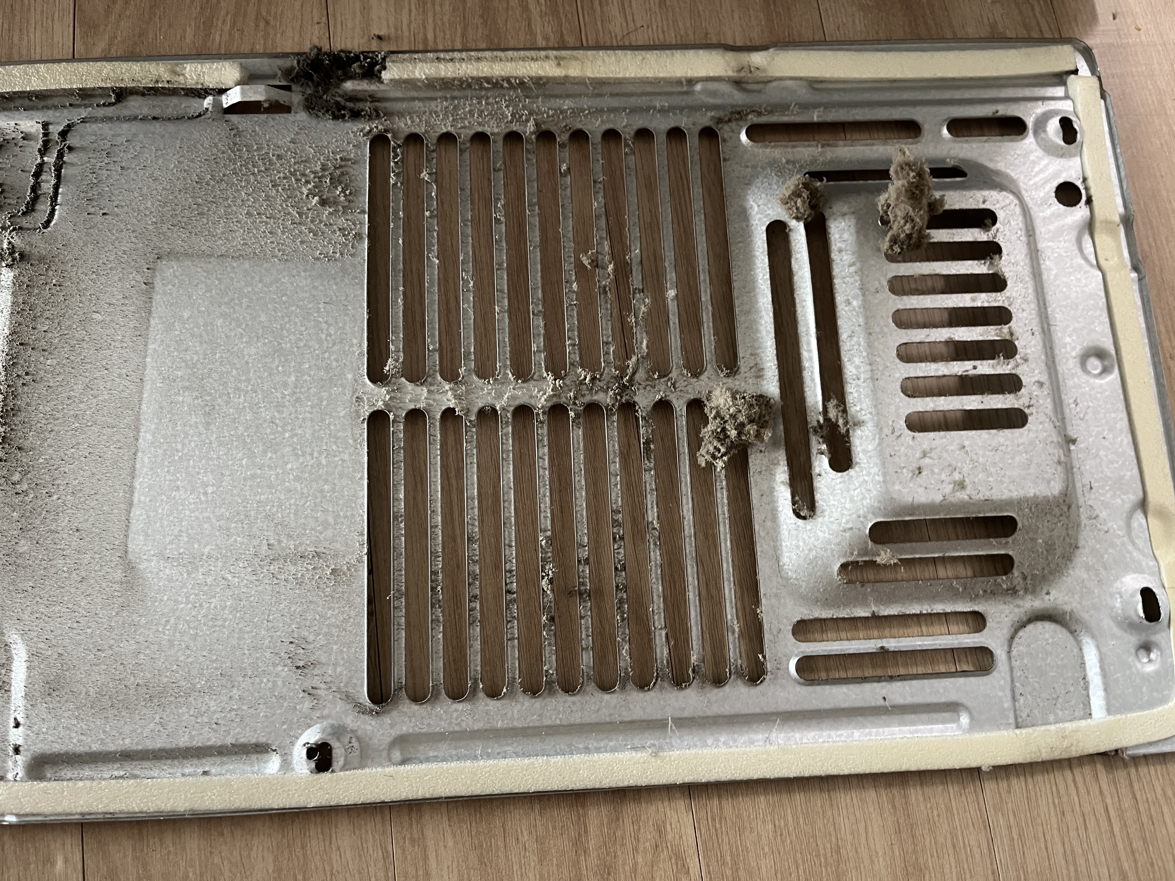 거의 4~5년 정도 된 거 같은데 솜처럼 먼지가 앉아있네요. 손으로 쥐면 두툼합니다. 냉장고 뒤쪽 팬뿐만 아니라 근처 벽/바닥까지 먼지가 가득합니다. 우선 주변에 있는 먼지를 사용한 섬유유연제 시트를 사용해서 제거해 줍니다.