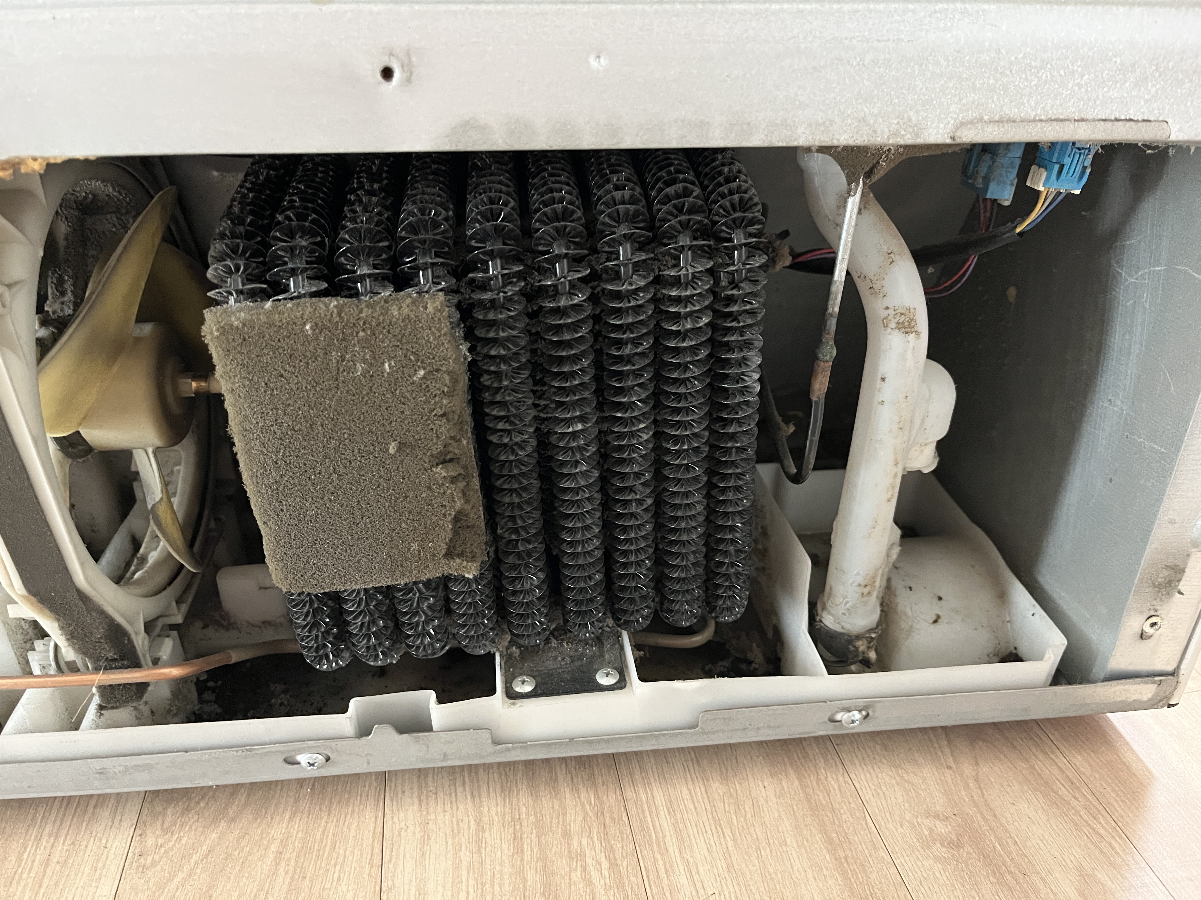 그리고 콘덴서 쪽 커버를 전동 드릴 드라이버로 분리해서 안쪽에 쌓인 먼지를 제거합니다. 저는 전문가가 아니라서 눈에 보이는 먼지만 제거했습니다.