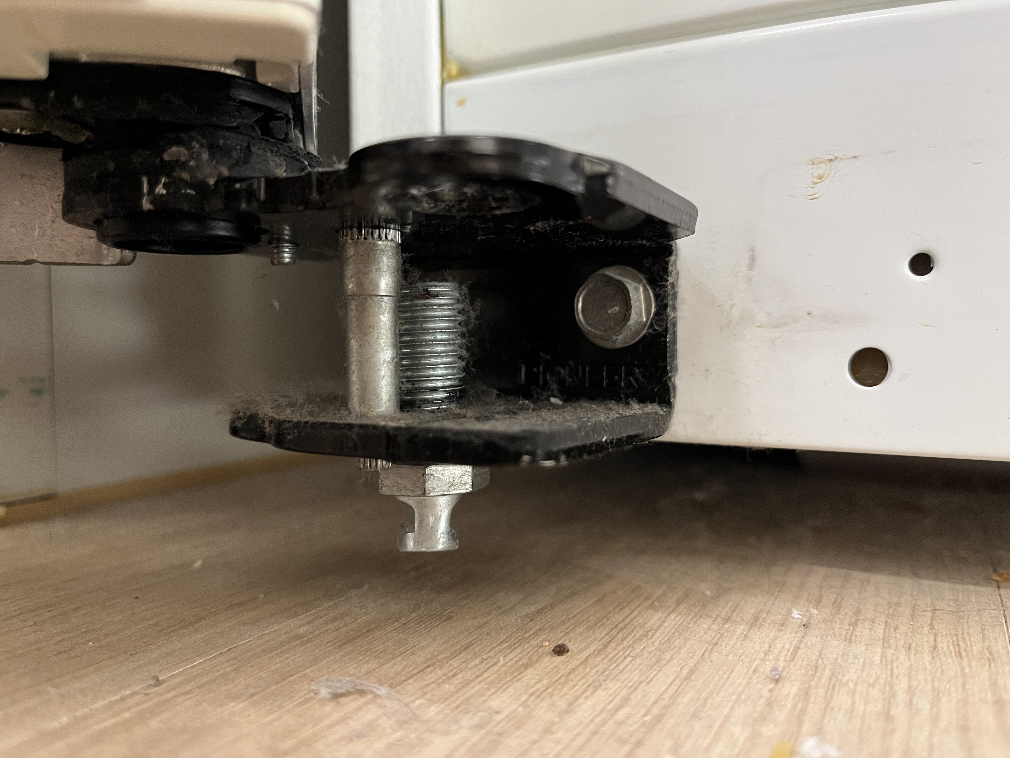 1) 냉장고 문 하부에 높이 조절용 볼트를 풀어줍니다. 청소 안 해서 여기에도 먼지가 수북하네요.